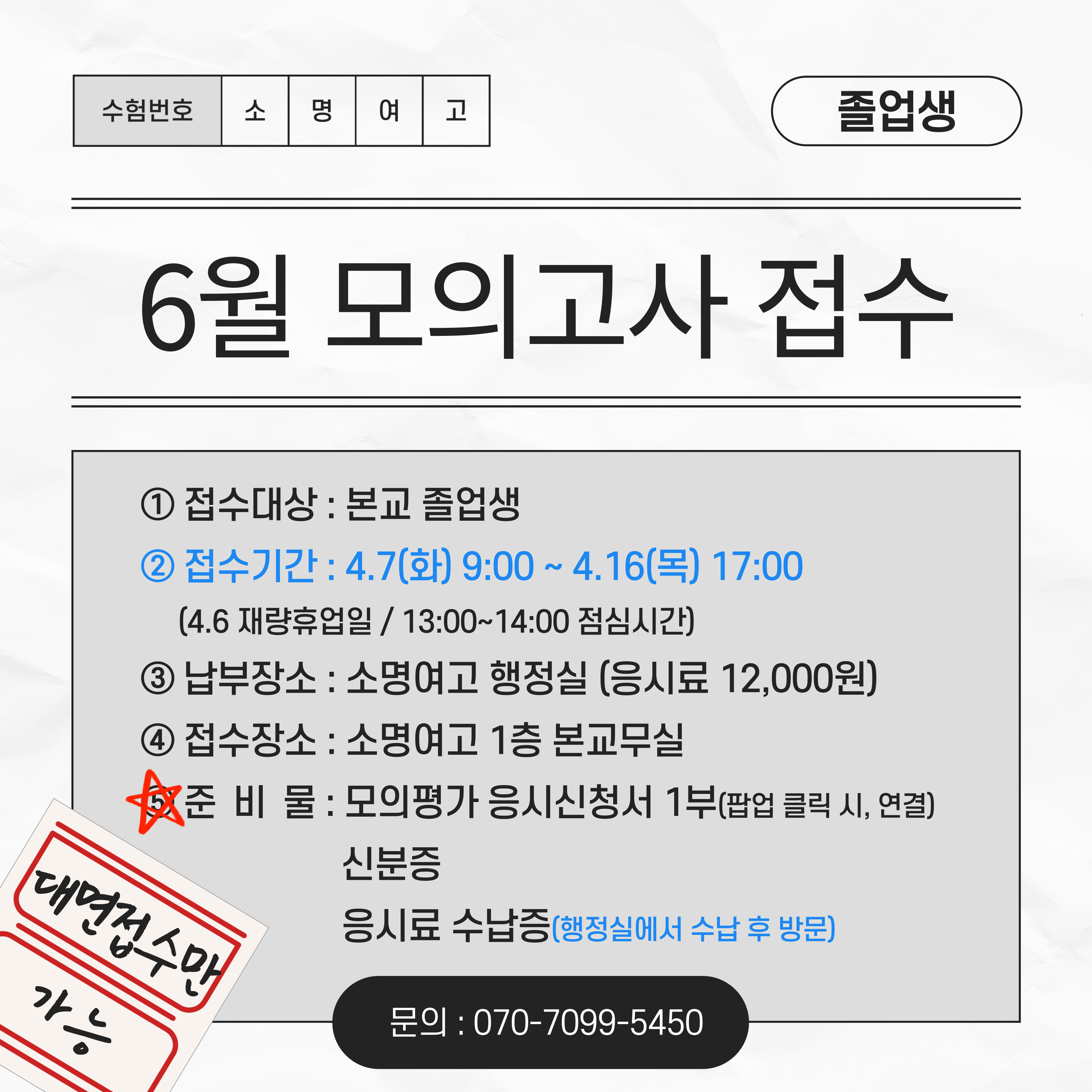 * 행정실에서 응시료 수납 후, 본교무실 방문바람
